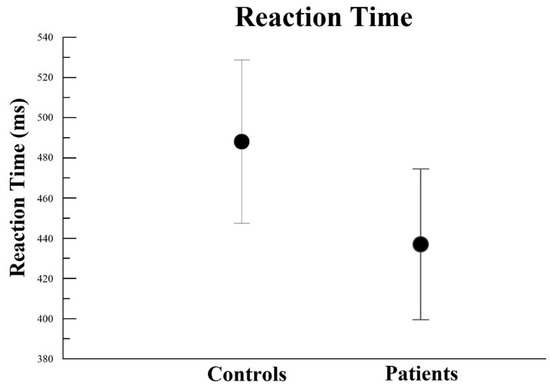 The findings of reaction time demonstrated no interaction by two-way mixed ANOVA (p > 0.05). However, there was a main effect for Group, with (F(2) = 10.73; p = 0.002; ƞ2p = 0.58; power = 98%) (Figure 10). We observed that HC control (average: 488.06 ± 40.67 ms) was slower than PD patients (average: 437.01 ± 37.55 ms). It is important to say that the experimental group’s RT performance was high compared to the control.