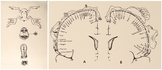 Evolution of homunculus. The illustration on the left is the 1937 homunculus, and the illustration on the right is the 1950 homunculus. The 1937 homunculus had a single figurine accounting for sensorimotor function. Illustrations adapted with permission from Leblanc (2021). The figurine is divided into four parts: body, face, tongue, and nasopharynx. The 1950 homunculus has distinct figurines showing the sensory and motor homunculus labelled as (A,B), respectively.