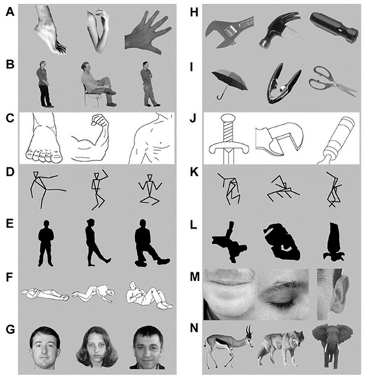 - Popivanov, I.D.; Jastorff, J.; Vanduffel, W.; Vogels, R. Stimulus Representations in Body-Selective Regions of the Macaque Cortex Assessed with Event-Related FMRI. Neuroimage 2012, 63, 723–741. [Google Scholar] [CrossRef]