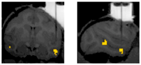 Electrophysiological recordings in non-human primates guided by fMRI. Adapted with permission from Kumar et al. (2019). BOLD activations in yellow indicate differences in BOLD responses evoked by the images of monkey bodies and objects. A vertical shadow indicates an electrode aimed at the ASB.