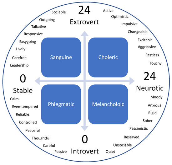 13]. The interplay between these two components, neurotic vs. stable and introverted vs. extraverted, combine to classify one’s personality as Choleric (extraverted and neurotic), Sanguine (extraverted and stable), Phlegmatic (introverted and stable), or Melancholic (introverted and neurotic).