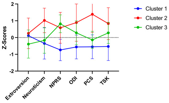 Figure 3, this subgroup included individuals with the least amount of neuroticism, low back pain intensity, and disability, as well as the lowest negative pain-related psychological factors. Cluster 2 (n = 27) was the smallest subgroup and consisted of individuals with high levels of neuroticism and high pain catastrophizing. This group had a lower pain intensity, compared with disability. Cluster 3 (n = 36) consisted of individuals with low extroversion and low pain catastrophizing. This cluster reported a higher pain intensity, compared with disability. Clusters significantly differed by these variables (