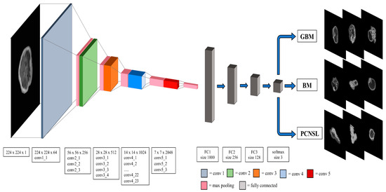 Model architecture trained as reported in Tariciotti et al. [13] and externally validated on the TeS dataset in the current study. The window size and stride for convolutional, maxpooling and fully connected layers are also presented. Conv: convolutional layer; FC: fully connected layer; GBM: glioblastoma; PCNSL: primary central nervous system lymphoma; BM: brain metastasis. “Reprinted with permission from Tariciotti et al. [13]. Copyright © 2022 Tariciotti, Caccavella, Fiore, Schisano, Carrabba, Borsa, Giordano, Palmisciano, Remoli, Remore, Pluderi, Caroli, Conte, Triulzi, Locatelli and Bertani. This is an open-access article distributed under the terms of the Creative Commons Attribution License (CC BY).