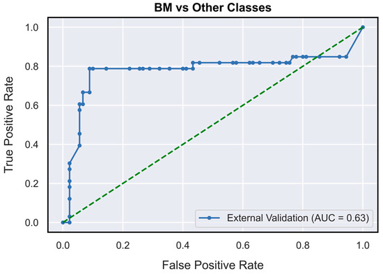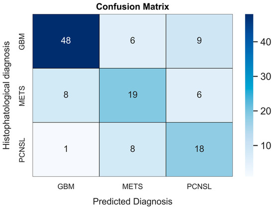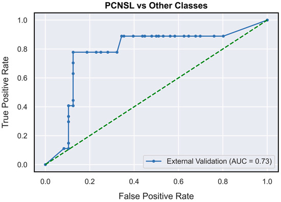 The validated DNN model (Figure 1) achieved AUCs of 0.73 (95% CI: 0.62–0.85), 0.78 (95% CI: 0.71–0.87) and 0.63 (95% CI: 0.52–0.76), respectively, for the PCNSL (Figure 2), glioblastoma (Figure 3) and BM (Figure 4) diagnostic classes. High reliability was reported across all performance metrics for PCNSLs and glioblastomas diagnostic outcome classes, while lower reliability was reported for BMs. The complete performance metric evaluation and the related confusion matrix are reported in Table 2 and Figure 5.