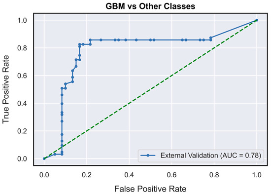 AUC-ROC curves (on TeS validation dataset) for glioblastoma diagnostic outcome class (OVR). GBM: glioblastoma; OVR: one-vs-rest.