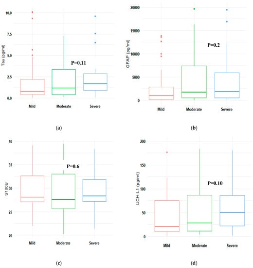 A comparison of median concentrations of biomarkers by TBI severity (a): Tau, (b) GFAP, (c) S100B, (d) UCH-L1, (e) NFL. UCH-L1: ubiquitin C-terminal hydrolase; NFL: neurofilament light; GFAP: glial fibrillary acidic protein; S100B: calcium binding protein; pg/Ml: picogram/millilitre.