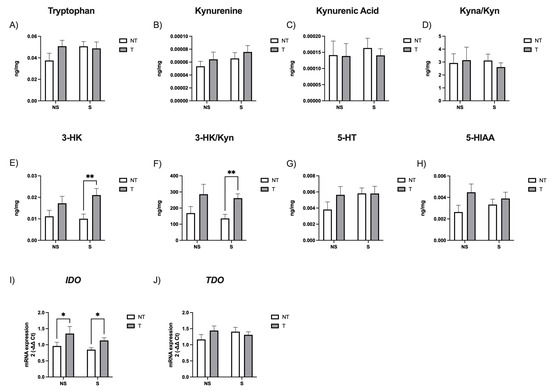 Hippocampal levels of (A) tryptophan, (B) kynurenine, (C) kynurenic acid, (D) Kyna/Kyn ratio, (E) 3-HK, (F) 3-HK/Kyn ratio, (G) 5-HT, (H) 5-HIAA and (I) IDO and (J) TDO mRNA expression. Data are expressed as mean ± SEM. Factors: no stress (NS), stress (S), no tumor (NT), and tumor (T). * p < 0.05, ** p < 0.001.