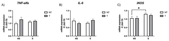 Hippocampal mRNA expression of (A) TNF-alpha, (B) IL-6 and (C) iNOS. Data are expressed as mean ± SEM. Factors: no stress (NS), stress (S), no tumor (NT), and tumor (T). * p < 0.05.