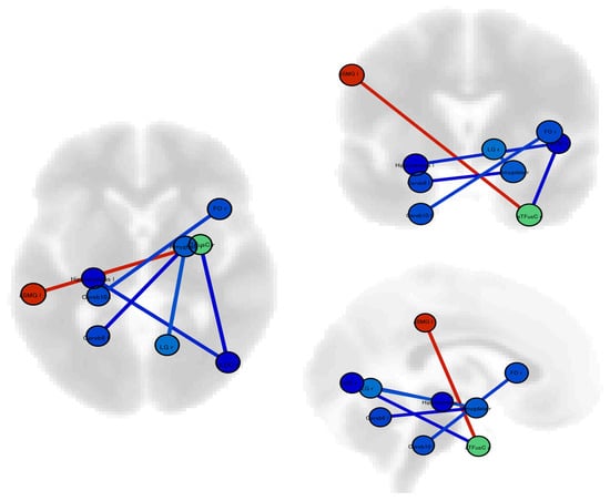 RS-fMRI preprocessing was completed using MATLAB R2015b (MathWorks Inc., Sherborn, MA, USA), Statistical Parametric Mapping software (SPM12, Wellcome Trust Centre for Neuroimaging, University College London, UK), and functional connectivity toolbox version 17 (CONN) []. We further compared static and dynamic resting-state functional connectivity using ROI-to-ROI analysis of 91 cortical, 15 subcortical, and 26 cerebellar areas identified a priori using the CONN toolbox. The experimental protocol for preprocessing and static and dynamic functional connectivity analyses was conducted in accordance with the methods described in our previous study []. In brief, static functional connectivity analysis was conducted through ROI-to-ROI analysis using the CONN toolbox [,]. In this approach, the target voxel BOLD time series S(x, t) was replaced by the target ROI time series Rj(t). The resulting ROI-to-ROI correlation matrices illustrate the functional connectivity levels between each ROI pair. The ROI-to-ROI correlation was determined using the Fisher-transformed bivariate correlation coefficient between the BOLD time series of the two ROIs. Dynamic independent component analyses were performed for the dynamic FC using the CONN toolbox [,]. These analyses investigated the temporal modulation properties of the ROI-to-ROI connectivity matrix to uncover circuits with similar modulated connections. Dynamic independent component analysis (ICA) matrices quantified the expression of different modulatory circuits and the connectivity change rate between ROI pairs, as indicated by the connectivity strength and sign variations co-varying with a specific component/circuit time series. Group-level modulatory components Gamma_l(i, j) were computed through several steps. First, a simplified generalized context-dependent psychophysiological interaction (gPPI) model was used to estimate the group-level modulatory components Gamma_l(i, j). These components were rotated using fastICA with a hyperbolic tangent contrast function. The ICA mixing matrix W was inverted to derive the dynamic IC/circuit time series. Finally, the group-level modulatory components were back-projected onto the subject-level components gamma_nk(i,j) via a series of standard first-level gPPI models, incorporating the estimated dynamic independent component/circuit time series h(t) as gPPI psychological factors. The results of effective connectivity are reported when significant at a level of p < 0.05, with the corrected false discovery rate (FDR).