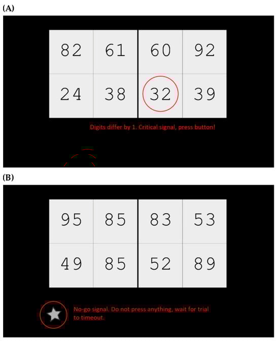 Additionally, we integrated a go/no-go task into the CVT to elevate its complexity and cognitive load, necessitating participants to exercise inhibitory control [47]. Throughout certain trials, participants encountered a visual no-go cue represented by a gray star (refer to Figure 1). These cues were presented selectively alongside a critical number. Participants were instructed to refrain from pressing any button and allow the trial to time-out when presented with the no-go cue.