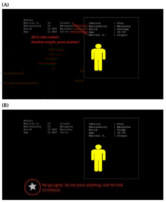To build the BCI computational model, we developed the Multi-Modal Integration Task (MMIT) to better reflect the working environment and stressors that an officer in a command-and-control center may face. The MMIT was based on the video game “Papers, Please”, in which the player takes the role of an immigration officer who is required to rapidly and accurately accept or reject people at a checkpoint [21]. This game is noted for its stressful gameplay, and has been discussed in publications involving philosophy and politics [22,23]. During the MMIT, participants are presented with procedurally generated suspects with several properties and are tasked to match them against a set of rules. The MMIT requires participants to sort through different categories of information to make a decision while under limited time, and time pressure is known to be a stressor [24].