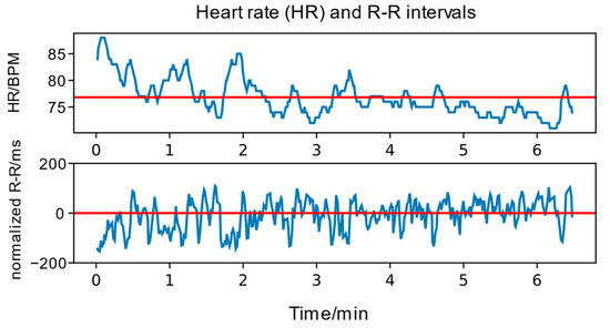 We used ECG recordings to derive heart rate variability (HRV) measurements, which can be used as a measure of objective stress [12,52]. The Polar ECG device produced an HRV measurement in the form of R-R intervals. Below, Figure 4 shows an example of the HRV parameters extracted from ECG recordings.
