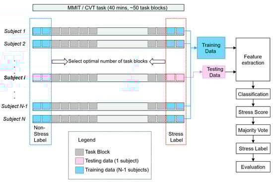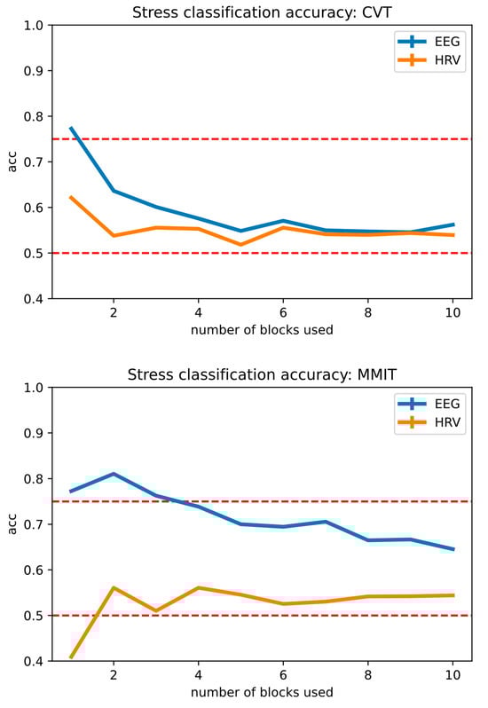 Both the CVT and MMIT are intentionally designed to provoke stress responses. We posit that the beginning of the task session can be characterized as a “non-stress” state, while its ending part represents a “stress” state. This hypothesis is substantiated by the DSSQ self-reported mental state assessment (See Figure 5). Consequently, each participant contributed two distinct sets of EEG data: one from the CVT and the other from the MMIT, both labeled for supervised stress classification. As depicted in Figure 6 below, this approach enabled us to identify the optimal number of task blocks for constructing the training dataset for optimal stress detection. To assess the effectiveness of our approach, we employed a leave-one-subject-out validation methodology. This involves partitioning our data into training and testing sets using an N−1 versus the remaining one participant split, ensuring a comprehensive evaluation and validation of our algorithms’ performance.