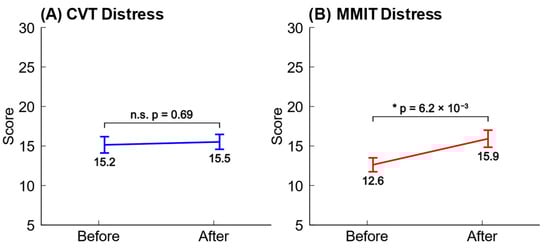 Changes in subjective stress levels before and after the CVTs and MMITs. Error bars represent the standard error of the mean, and the significance levels were calculated using paired two-tailed t-tests (α = 0.05). (A) Performing the CVT did not significantly increase the reported levels of distress. (B) Performing the MMIT significantly increased the reported levels of distress.