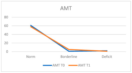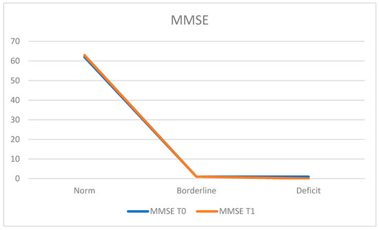 n = 6 patients) obtained a borderline score. The average score at T1 was 4.97 ± 0.86. A slight decline in performance is noted, considering that three patients who scored within the normal range at T0 did not achieve the same performance at T1, moving to a borderline score (