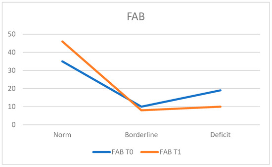 n = 8 patients) obtained borderline scores. The average FAB score at T1 was 15.15 ± 2.60, indicating an improvement in executive performance at T1, considering that the number of previously deficient patients decreased from 19 at T0 to 10 at T1 (