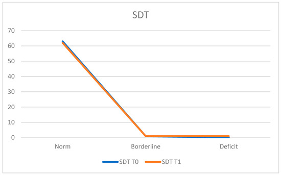 In the assessment of attentive and visual perception using the Segments Discrimination Test (SDT), at T0, 98.4% of the population (n = 63 patients) demonstrated normal functioning, while 1.6% (n = 1 patient) achieved a borderline score.