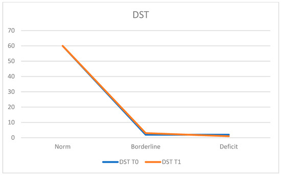 To assess short-term verbal memory and working memory using the Digit Span Test (DST), at T0, 93.8% of the population (n = 60 patients) demonstrated normal functioning, while 3.1% (n = 2 patients) obtained deficient scores and 3.1% (n = 2 patients) achieved borderline scores.