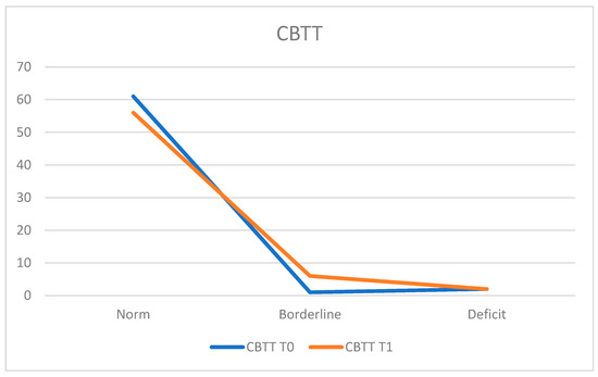 At T1, 84.4% (n = 54 patients) remained within the normal range, 6.3% (n = 4 patients) presented deficits, and 9.4% (n = 6 patients) obtained borderline scores.