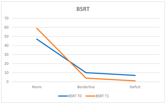 To assess verbal episodic memory, the Babcock Story Recall Test (BSRT) was administered. At T0, 73.4% of the population (n = 47 patients) obtained results within the normal range, while 10.9% (n = 7 patients) exhibited deficits and 15.6% (n = 10 patients) achieved borderline scores.
