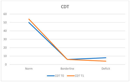 The Clock Drawing Test (CDT) assessed visuospatial and executive functions. At T0, 78.1% of the population (n = 50 patients) obtained results within the normal range, while 12.5% (n = 8 patients) exhibited deficits and 9.4% (n = 6 patients) achieved borderline scores.