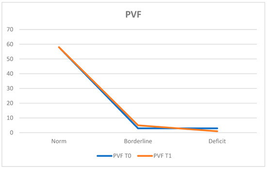 The Phonemic Verbal Fluency Test (PVF) assessed phonemic word production. At T0, 90.6% of the population (n = 58 patients) obtained results within the normal range, while 4.7% (n = 3 patients) exhibited deficits and 4.7% (n = 3 patients) achieved borderline scores.