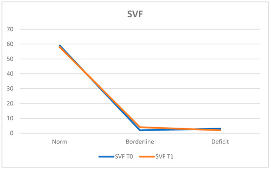 The Semantic Verbal Fluency Test (SVF) assessed semantic knowledge. At T0, 92.2% of the population (n = 59 patients) obtained results within the normal range, while 4.7% (n = 3 patients) exhibited deficits and 3.1% (n = 2 patients) achieved borderline scores.