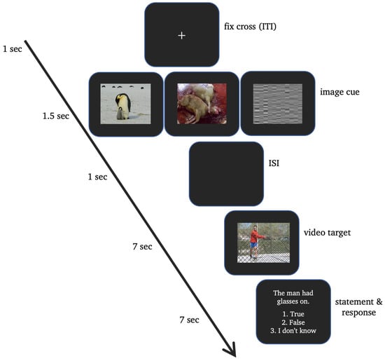 Task schematic. Each trial began with an image cue (1.5 s) that was positive (left), negative (middle), or neutral (right) in valence, followed by an ISI (1 s). A video then was displayed (7 s), followed by a statement and a response period (7 s). Participants indicated their responses by pressing “True”, “False”, or “I don’t know”. The trial continued with an ITI (1 s) represented by a fixation cross.