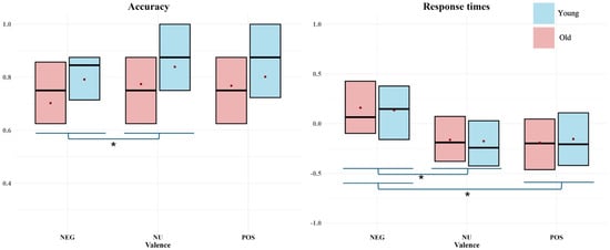 Behavioural results: Box plots showing accuracy (left) and RTs (right) by age group and valence. Each box represents the interquartile range, with the lines representing the median of each condition (NEG = negative; NU = neutral; POS = positive), and the dots showing the mean of each condition. Asterisk (*) denotes statistical significance (p < 0.005).
