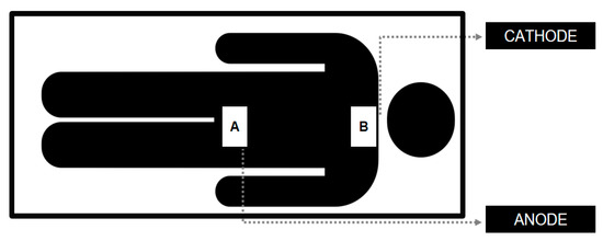 tsDCS electrodes positioning (2024). (A): 12th thoracic vertebra; (B): 7th cervical vertebra.