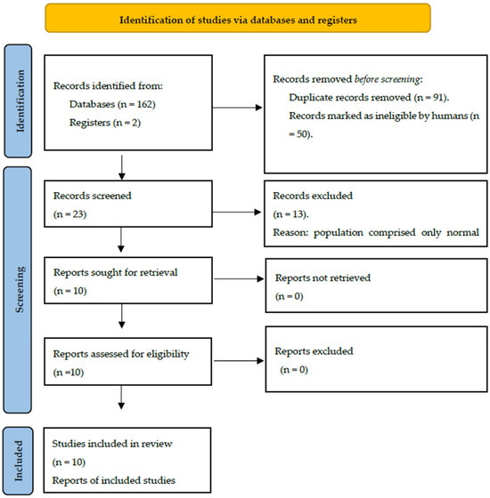 From the databases, a total of 164 articles were identified. Following the initial screening step and removal of duplicates (n = 91), 73 articles remained. Among the 73 articles, 23 articles were included based on title evaluation (Bishop et al., 2012; Bruneau et al., 2003; Bruneau et al., 1999; Bruneau et al., 2015; Cacace et al., 1988; Carrillo-de-la-Peña, 1999; Čeponien et al., 1998; Clunies-Ross et al., 2015; Clunies-Ross et al., 2018; Gomes et al., 2012; Groen et al., 2008; J. A. Hämäläinen et al., 2011; Ponton et al., 2002; Shafer et al., 2011; Silva et al., 2020; Rinker et al., 2021; Taylor et al., 2003; Tonnquist-Uhlén, 1996; Tonnquist-Uhlen et al., 2003; Wolpaw & Penry, 1975, 1977; Wagner et al., 2016; Woldorff & Hillyard, 1991) [18,21,23,26,29,35,36,37,39,40,45,46,47,51,52,53,54,55,56,57,58,59,60]. As a result of abstract screening, 13 studies were excluded, as they did not include abnormal populations among their participants (Bruneau et al., 2015; Cacace et al., 1988; Carrillo-de-la-Peña, 1999; Čeponien et al., 1998; Clunies-Ross et al., 2015; Clunies-Ross et al., 2018; Ponton et al., 2002; Silva et al., 2020; Tonnquist-Uhlen et al., 2003; Wolpaw & Penry, 1975, 1977; Wagner et al., 2016; Woldorff & Hillyard, 1991) [26,35,36,37,40,45,46,47,51,52,56,59,60]. The remaining ten articles underwent a thorough full-text screening, and all of them met the eligibility criteria and were consequently included in this study. The PRISMA flow diagram is presented in Figure 2. The data, encompassing information about experimental and control groups, event-related potentials (ERPs) of interest, and the results, have been succinctly summarized in Table 1.