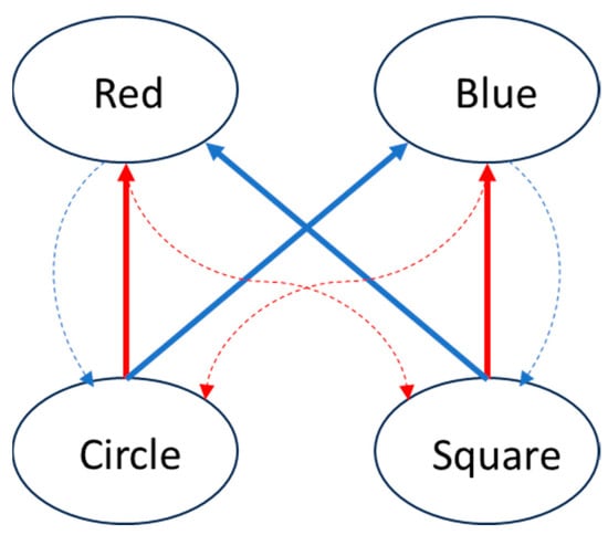 The discussion for this paper is more interested in the variable binding problem, which remains unsolved. Rather than recognising a red square and blue circle from visual input, these objects would be generated internally in the human mind. Thus, there must be pattern representations of them in the brain, but the problem is—how can the individual pattern concepts get shared, while these pattern constellations remain distinct? As discussed in [21], one option called phase binding breaks the cycle of neural firing into discrete time slices, which could divide local firing patterns into separate phases, but the idea is contentious. Temporal phase coherence is no longer considered a major contender in feature binding, in part because it would be much too slow. It is much more relevant in variable binding where most other models do not apply. The other basic model is brute force enumeration of all possible variable bindings. The problem is that there are a potentially unbounded number of items that might be bound to a variable, so none of the pair-coding techniques can work. Solutions to the problem, especially when it goes to implementing them in something like neural networks, is still an open question. Even for the visual system, it is thought that at least two segregated pathways are required. One to recognise the objects and one to recognise their relative spacing. However, with this, there is still a problem of how to bind multiple attributes to an object. Recent attempts include [22,23]. Han and Seren [22] state that their results agree with experimental evidence that shows the visual system in our brain is primarily using spatial maps to encode different attributes of objects. Of course, the solution proposed here is a bit simpler. It does not require temporal spiking or synchronization, and it does not have to be spatially aware. However, it does require the network components to be constructed in a certain, not too unreasonable, way.