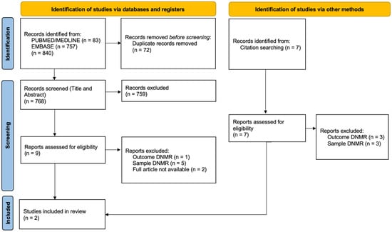 The PRISMA-P diagram shown in Figure 1 summarizes the article selection steps and the characteristics of the excluded studies, where “DNMR” corresponds to “does not meet requirements”.