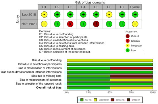 The risk of bias of the studies under analysis was assessed using the Cochrane’s “Risk Of Bias In Non-Randomized Studies—of Interventions (ROBINS-I)” []. The figures corresponding to the risk of bias were created using the robvis (Risk Of Bias VISualization) tool [].