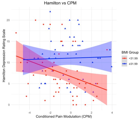 Using a BMI cutoff of 31.99 kg/m2, we stratified the sample into two groups: BMI < 31.99 and BMI ≥ 31.99 kg/m2. In the group with a BMI < 31.99, a statistically significant negative association was found between CPM and HDRS (β-coefficient = −0.98; p-value = 0.017), suggesting that an increase in CPM corresponds to a decrease in depression scores. However, this relationship was not observed in the BMI ≥ 31.99 group, where no statistical significance was detected (p-value = 0.93).