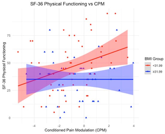 Figure 2. Association between Conditioned Pain Modulation (CPM) and SF-36 Physical Functioning scores, stratified by BMI groups. The red line represents individuals with BMI < 31.99, while the blue line represents individuals with BMI ≥ 31.99. Shaded areas indicate 95% confidence intervals. A statistically significant positive association is observed in the lower BMI group, whereas the higher BMI group shows no clear trend, suggesting a potential disruption in the relationship between CPM and physical functioning in individuals with higher BMI.