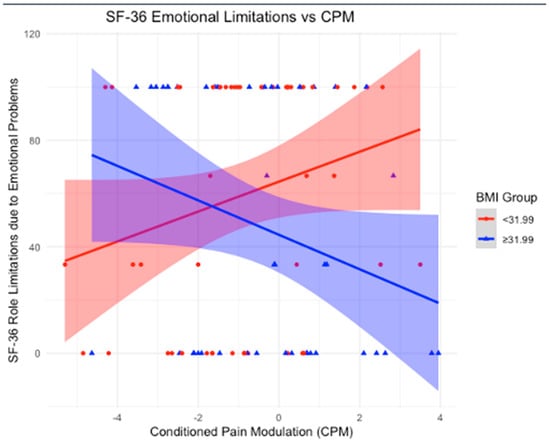 Figure 3. Association between Conditioned Pain Modulation (CPM) and SF-36 Role Limitations due to Emotional Problems scores, stratified by BMI groups. The red line represents individuals with BMI < 31.99, while the blue line represents individuals with BMI ≥ 31.99. Shaded areas indicate 95% confidence intervals. A statistically significant positive association is observed in the lower BMI group, whereas the higher BMI group shows a negative association, suggesting a potential disruption in the relationship between CPM and emotional role functioning in individuals with higher BMI.