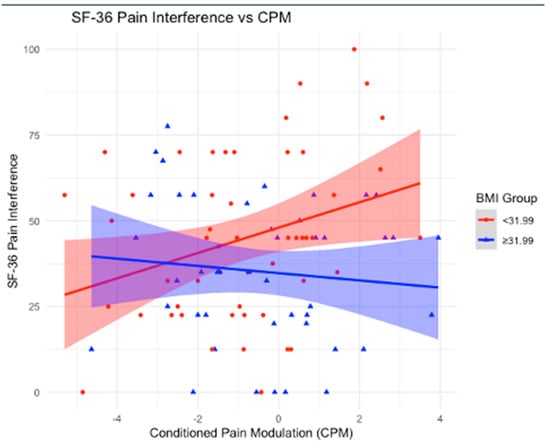 Figure 5. Association between Conditioned Pain Modulation (CPM) and SF-36 Pain Interference scores, stratified by BMI groups. The red line represents individuals with BMI < 31.99, while the blue line represents individuals with BMI ≥ 31.99. Shaded areas indicate 95% confidence intervals. A statistically significant positive association is observed in the lower BMI group, whereas the higher BMI group shows no clear trend, suggesting a potential disruption in the relationship between CPM and pain interference in individuals with higher BMI.