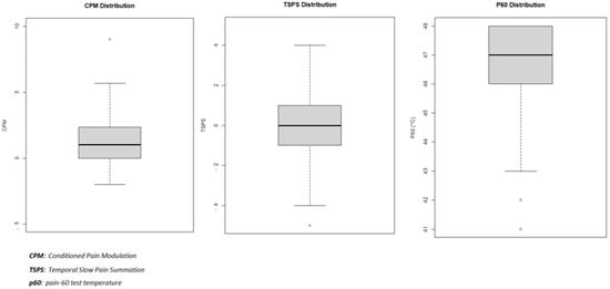 During the baseline assessment, we measured the sensory profile using quantitative sensory testing (QST). Our current analysis focused on Conditioned Pain Modulation (CPM), Temporal Slow Pain Summation (TSPS), and Pain-60. CPM evaluates individuals’ ability to inhibit pain, serving as an indirect estimation of the Descending Pain Modulatory System (DPMS). The technique activates a cortically regulated spinal–bulbospinal loop through the Diffuse Noxious Inhibitory Control (DNIC) [