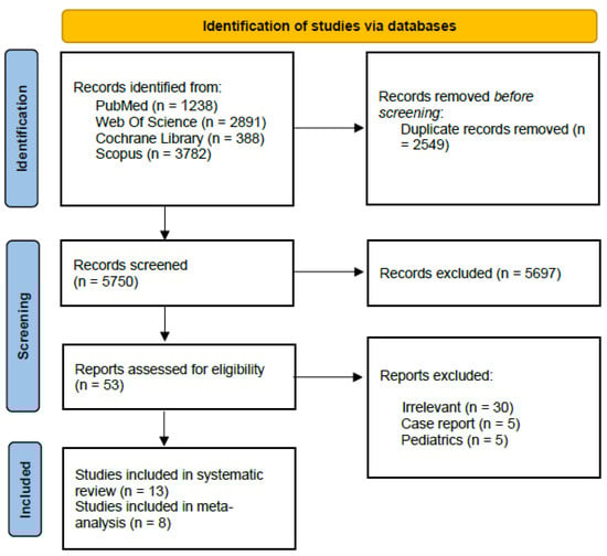 Our search identified 8299 records, with 2549 being duplicates. A total of 53 studies were retrieved. Out of them, 13 studies met our pre-specified criteria and were included in this systematic review [4,5,6,8,9,12,13,18,19,20,21,22,23], with 5 studies not included in the analysis [5,6,8,9,22]. The PRISMA flowchart is shown in Figure 1.