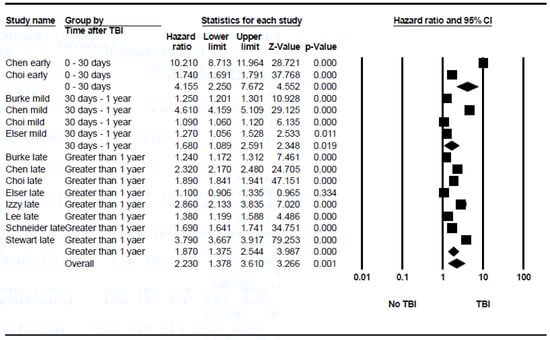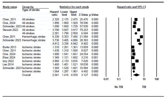 The analysis was conducted using Comprehensive Meta-Analysis (CMA) version 3 software. The pooled hazard ratios (HRs) were obtained. Two studies reported the effect estimate as rate ratio and were not included in the analysis [5,9]. A random-effects model was employed in all analyses to consider the variability among the included studies. Subgroup analyses were conducted based on type of stroke, post-TBI phases, and severity of TBI. Heterogeneity was evaluated using the I2 statistic, with values over 50% and a p value below 0.1 indicating significant heterogeneity [16]. Egger’s test and funnel plots were applied to evaluate publication bias; asymmetrical funnel plots or a significant result from Egger’s test would suggest the presence of potential publication bias [17].