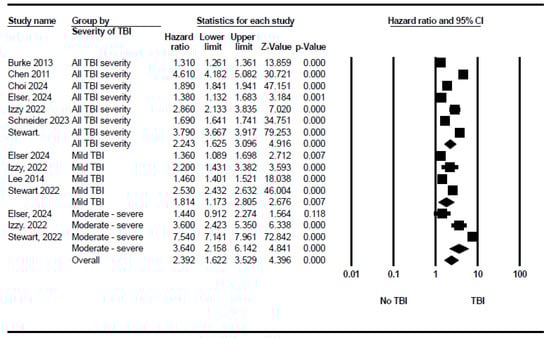The other three studies, Nyam et al., Liao et al. and Liu et al. [6,8,22], were excluded from the meta-analysis due to potential data overlap with each other and with the studies by Chen et al. and Lee et al. that were already included [4,21]. These studies used data from Taiwan’s National Health Insurance Research Database with overlapping study periods, which could lead to duplicated data points across analyses. By excluding these studies, we aimed to minimize redundancy and potential biases that could otherwise skew the meta-analysis results. This approach ensures that the findings represent unique patient groups and maintains the validity of our pooled estimates. Liao and colleagues analyzed a total of 30,165 TBI cases and 120,660 individuals without TBI from Taiwan’s National Health Insurance Research Database from 2000 to 2004, monitoring stroke risk through to 2008. They found that TBI patients had a significantly higher risk of stroke (HR = 1.98) than those without TBI. Furthermore, TBI severity was correlated with post-stroke mortality, highlighting the need for targeted prevention [22]. Liu and colleagues analyzed data of 13,652 concussion cases from the same registry from 1998 to 2005. This concussion group was then compared to an equivalent group matched by sex, age, and propensity score. Stroke risk was notably elevated in those with concussion, with both crude and adjusted hazard ratios indicating a heightened risk. Similarly, Nyam and colleagues reviewed data from the same registry from 2000 to 2012. They reported that TBI had increased the risk of major adverse cardiac and cerebrovascular events (MACCEs) by 2.77-fold. The risk of hemorrhagic stroke alone increased by 6-fold [6].