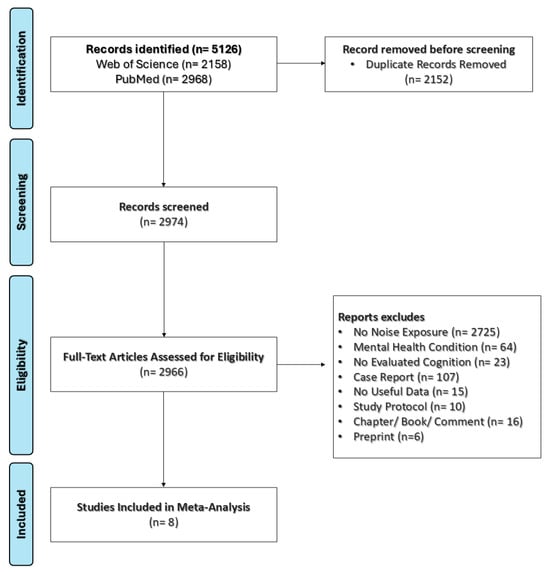 In this meta-analysis, we evaluated the impact of noise exposure on cognitive function among children and adolescents. A comprehensive database search initially yielded 5126 articles, of which eight studies from Korea, Switzerland, the United Kingdom, South Africa, and Sweden were included in the final analysis. The total sample was evenly divided between the experimental group (n = 1687) and the control group (n = 1698). The PRISMA flow diagram, presented in Figure 1, illustrates the study selection process.