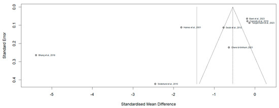 To assess the robustness of the meta-analytic findings, we conducted a sensitivity analysis by iteratively excluding one study at a time and recalculating the overall standard mean difference (SMD). The range in SMDs observed during this analysis was −0.3924 to −0.7167, indicating that the overall effect size remained negative across all scenarios.