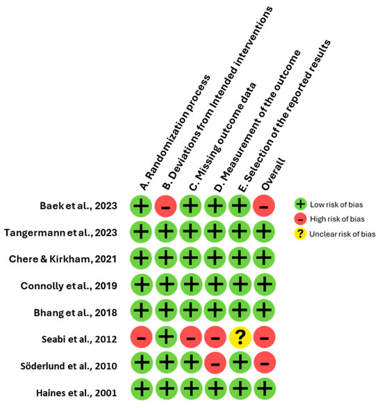 The quality evaluation of the included studies was performed using the Risk of Bias 2 (RoB 2) tool [12]. This assessment was carried out independently by two researchers, D.F.-Q. and J.G.-E., with S.L. available as an arbitrator in the event of discrepancies, though such intervention was not required due to unanimous agreement. The RoB 2 tool examines potential bias across five core domains: (1) the process of randomization, (2) deviations from intended interventions, (3) incompleteness of outcome data, (4) accuracy of outcome measurement, and (5) the selection of reported results. Each domain is evaluated based on specific signaling questions and classified into one of three categories: low risk, some concerns, or high risk. The overall risk of bias is then determined by aggregating the ratings across all domains. Studies are classified as high risk if any domain is deemed high risk or if multiple domains raise concerns. Conversely, a study is categorized as low risk when all domains are rated low risk, whereas studies with limited domains of concern fall into the intermediate category of some concerns.