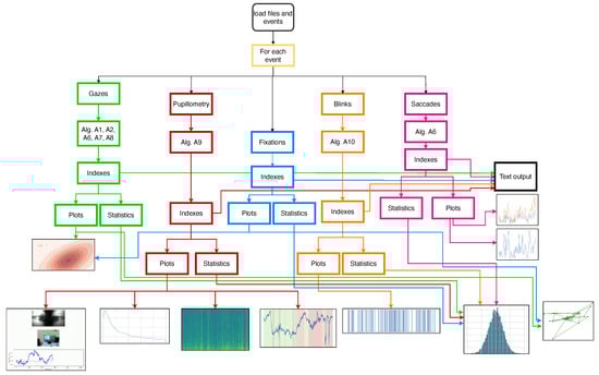 This flowchart illustrates the analysis procedure for eye tracking data via custom software. The software analyses fixations, gaze, pupillometry, and blink data to generate and display various indices, statistics, and plots. Algorithms are detailed in the appendix. The colours depict features and their preprocessing flows. The outputs include image, video, or text and may overlap for certain features.