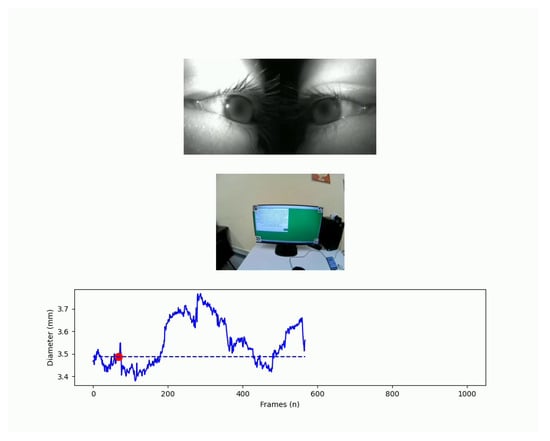 A frame of one output of SPEED. This output includes external and internal videos and the pupillometry amplitude time-series. The pupils are blurred to preserve the biometric data of the participant.