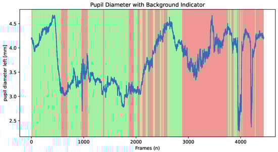 Furthermore, the software provides a feature, illustrated in Figure 4, to plot pupillometry time series with colour coding to indicate when a user is looking at the screen, which is useful to analyse focus within the ROI.