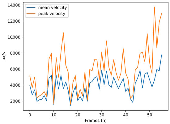 Mean (in blue) and peak (in orange) of saccade velocity (pixels/ms) over time (frames).
