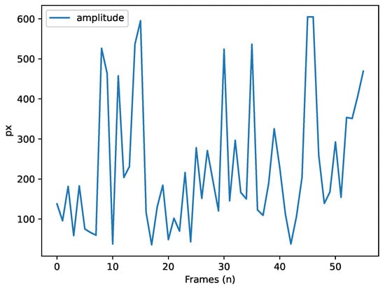 Saccade amplitude (pixels) over time (frames).